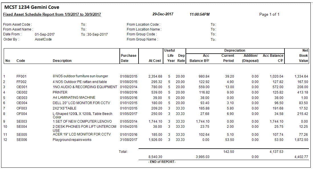 Print Fixed Asset Schedule and other reports. Always have up-to-date asset values and depreciation details.